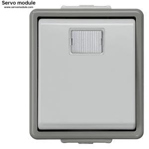 Description:DELTA flaeche IP44, AP Dark gray/light gray button, 10A 250V with separate feedback signal with white window, 66x 75 mm