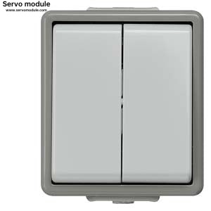 Description:DELTA fl?che IP44, AP Dark gray/light gray double two-way switch 10A 250V, 66x 75 mm